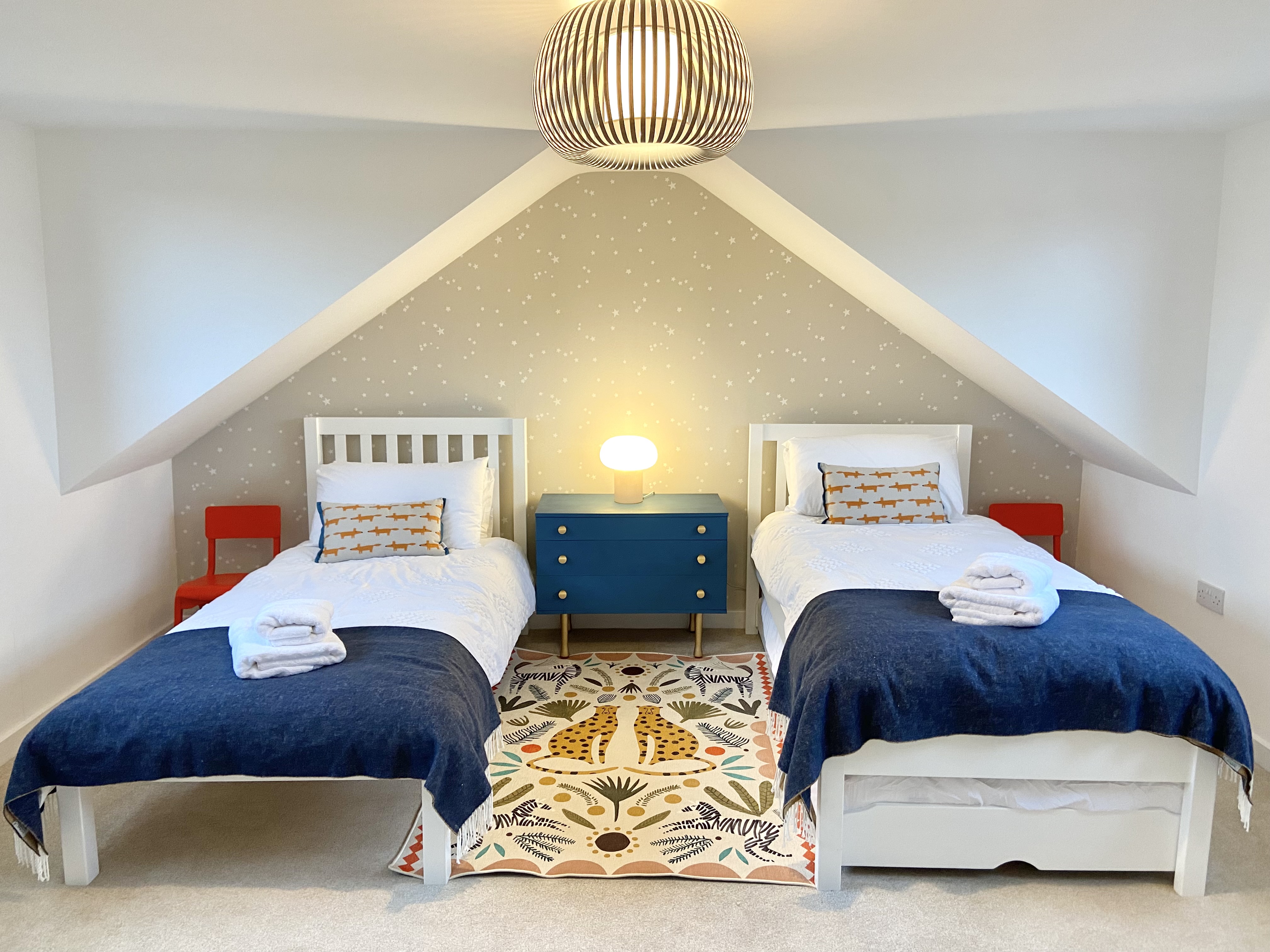Bedroom 2 (upstairs) with twin single beds and adjacent family bathroom
